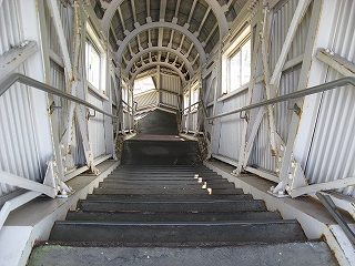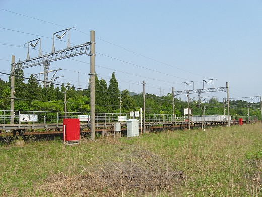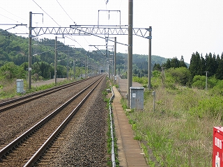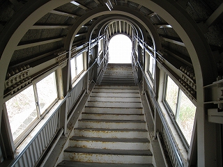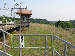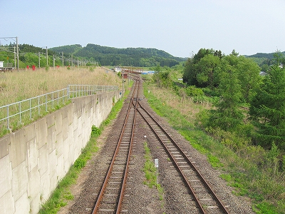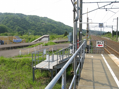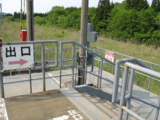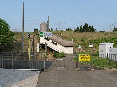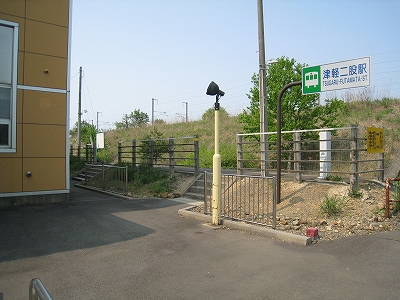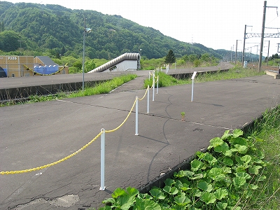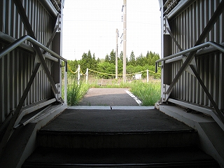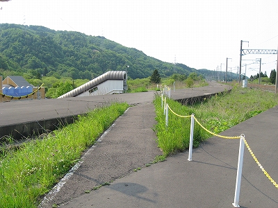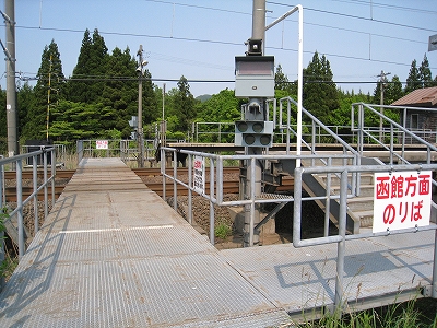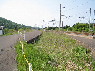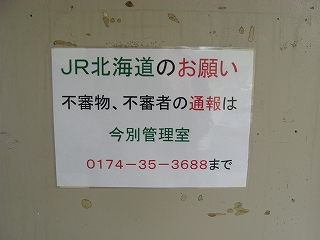 およそ客を捌く気のない いかにも暫定的な細い階段を上り、高速運転可能な津軽海峡線の走る路盤へ向かうが、通路は周囲の雰囲気にそぐわずやたらパトロールや警備という文字が目につく。構造がやや複雑で、ここもまた知内のように上下各2本しか来ないため人目にも付きにくく、知らない人が居つきやすいのだろう。コンクリートの四角な巨大トンネルの上に登りつくと、そうとう余分に路盤を取っていて、将来1線か2線入るほどもある溝の一部埋めて通路にしているところを歩かされびっくりする。へたに自由に歩くとこのトンネルの上から落ちるか、未使用の路盤の穿に陥りそうな怖いところだ。なにせ柵がチェーンのみで心もとない。ともかく、ずっと先の計画を考えていたらしいゆえ、こんな荒涼として中途半端なまま、非合法な感じのする駅として今の今まで放置されていたところだというのがよくわかった。