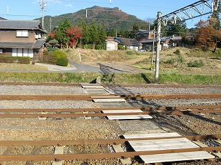 構内踏切。ヤードに留めた列車から降りてくる乗務員などが使うものかな。