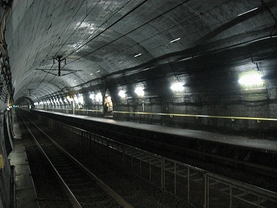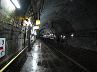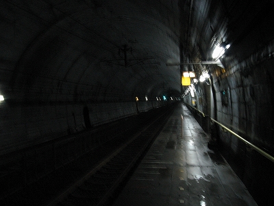夏なのに肌寒いほどの冷感、異様なほどの湿気、まぶしい旧寝台車の灯りがトンネルの側壁を照らし、黒部ダムや下の廊下の、あの危険な工事用通路みたいな細いホームを、高校生が談笑しつつ何人も歩いて行く。
