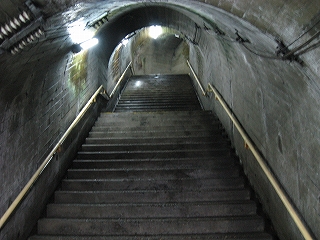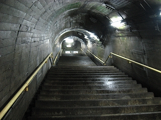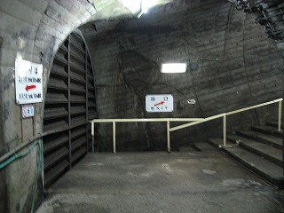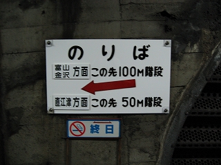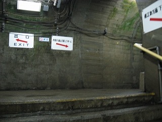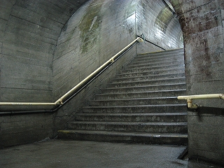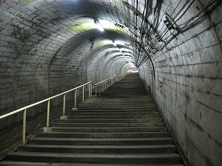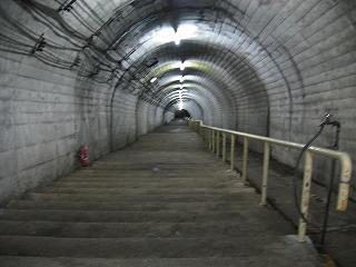 大階段に足を掛けると、これが本坑らしいので、ふっと振り返ると、柵でふさがれた本坑が地下奥深くまで続いていた。それで気付いた、これ工事用のずり出し用斜坑なのか…そうか。わざわざ駅のためにこんなの掘らないもんね、と一人合点して階段を上った。左の端の方は段を刻んでいないゆえにスロープになっていて、しばしなぞるように眺めながら上り進む。すべて階段にし通さなかったのにはどんなわけがあるのだろうと思わず考えてしまう。スロープを滑らせ斜坑の奥まで資材の搬入でもするのだろうか。