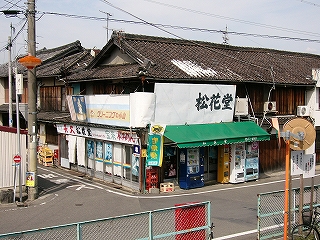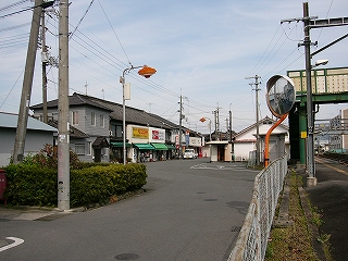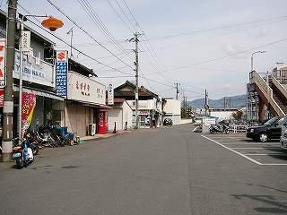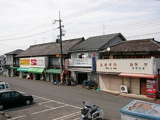名所案内の近くから垣間見える駅前の風景。 家庭の電気傘みたいな街頭が古い。