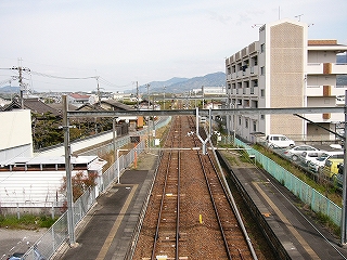 跨線橋に立つとやはり駅周辺がやや見たわせる。 あたりは昔からの宅地だったが、駅を出てすぐの向かいには、 ちょっとした古い商店が立ち並んでいる。 また離れたところにはいくつか新しいマンションもあって、 この町でも新しい人の生活が描けそうだった。 向こうにもう一つ跨線橋が架かっていた。 そっちは駅の表と裏を結ぶもので、打田こ線人道橋と名づけられてあった。 あとで上ってみるとその橋の方が見晴らしがよかった。