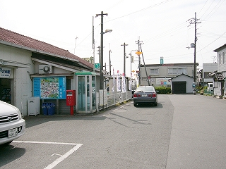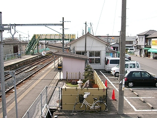 駐車場と駅舎。左手に写っている橋は駅の裏表を結ぶ人道橋。