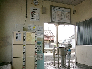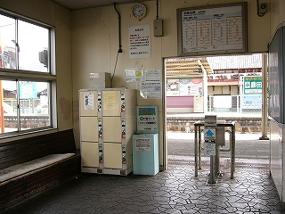 椅子から見た改札口。時計とコインロッカーが設置されている。