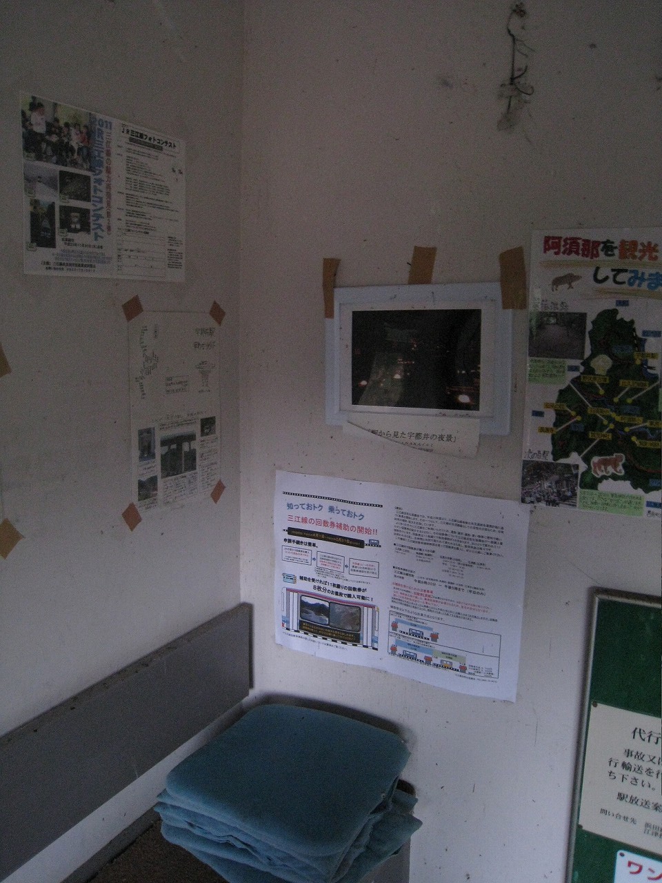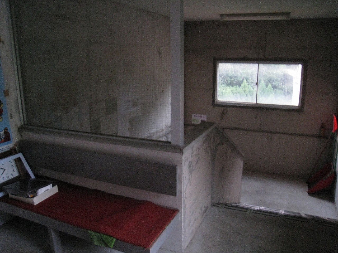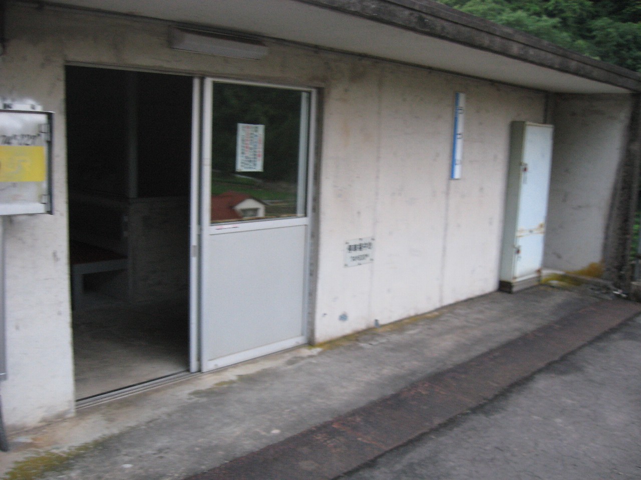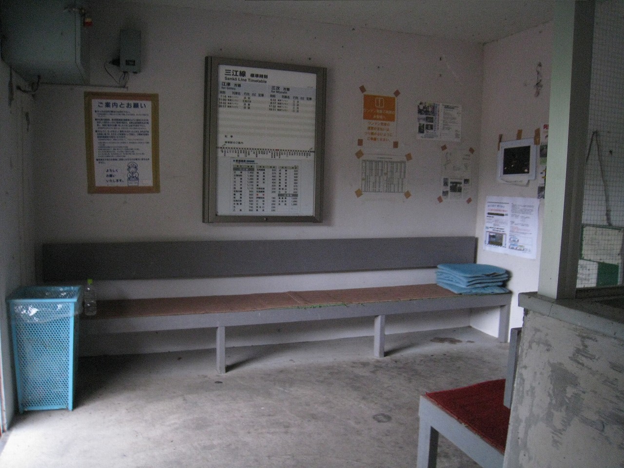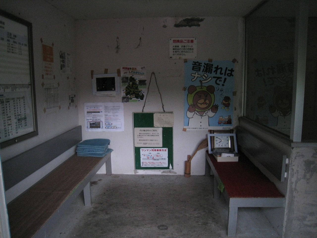 駅ノートや筆記具、時計などがごちゃごちゃと置かれた待合室は傷んだコンクリートに囲まれた薄暗い階段室の中では、廃墟の中の残置物にも見えなくはない。けれどここには列車が来るし、何よりも自分という旅人が駅寝したんだ。そのことが何よりも駅を生かしたように思った。しかし床面には虫の死骸が飛び散り、よくこんなところで寝ていたなと。