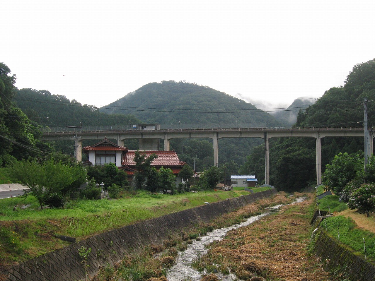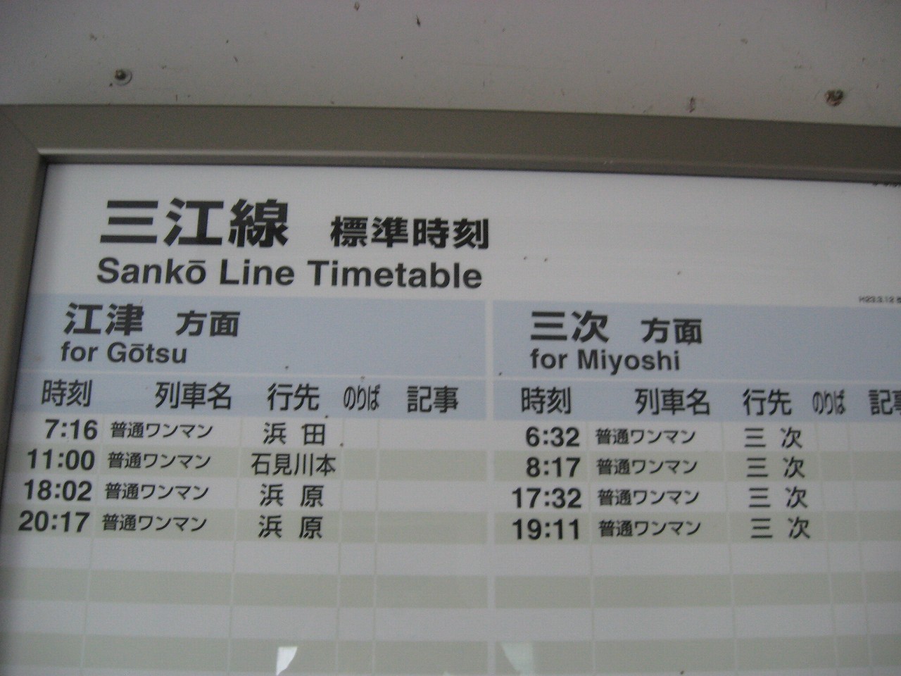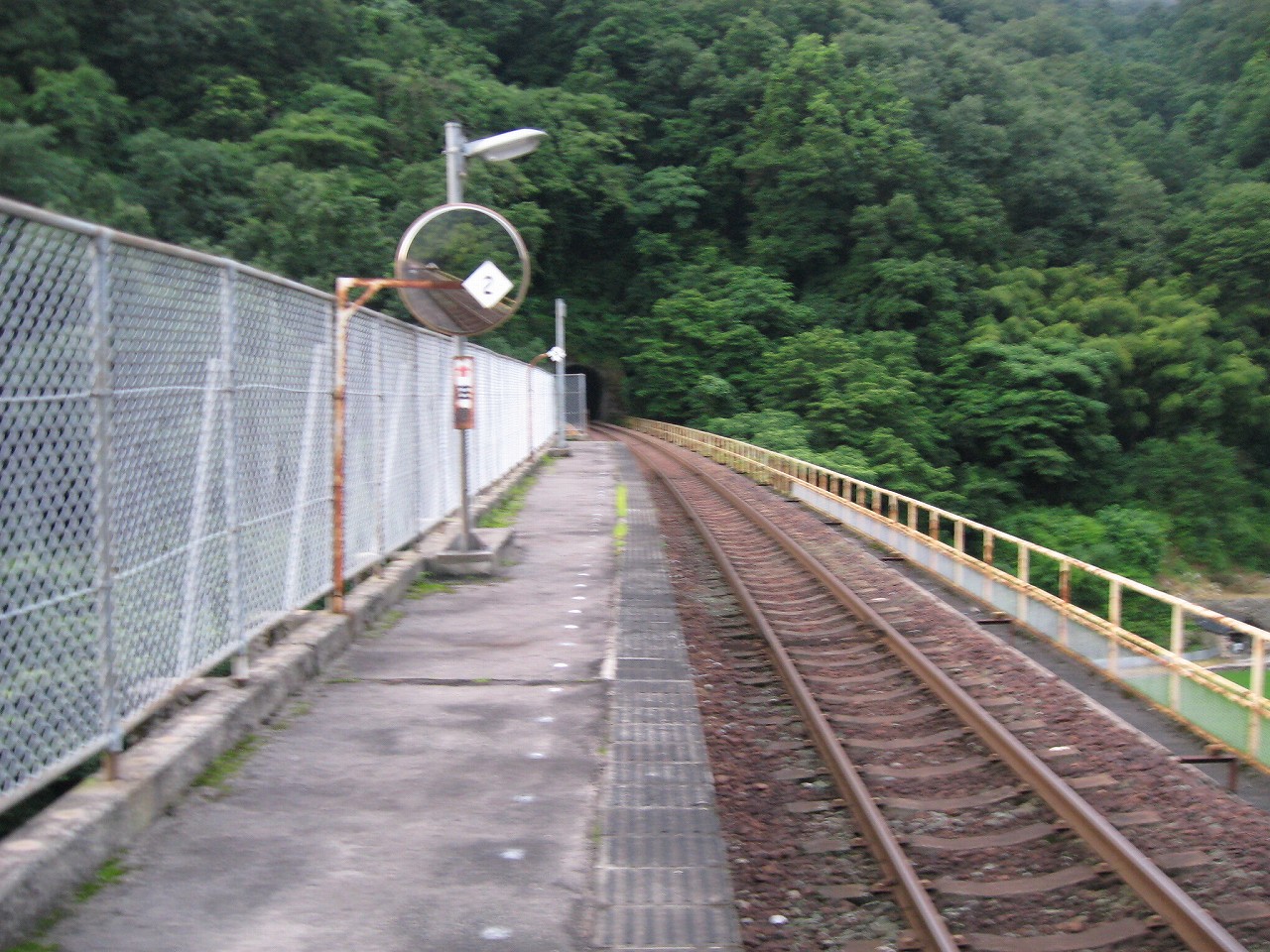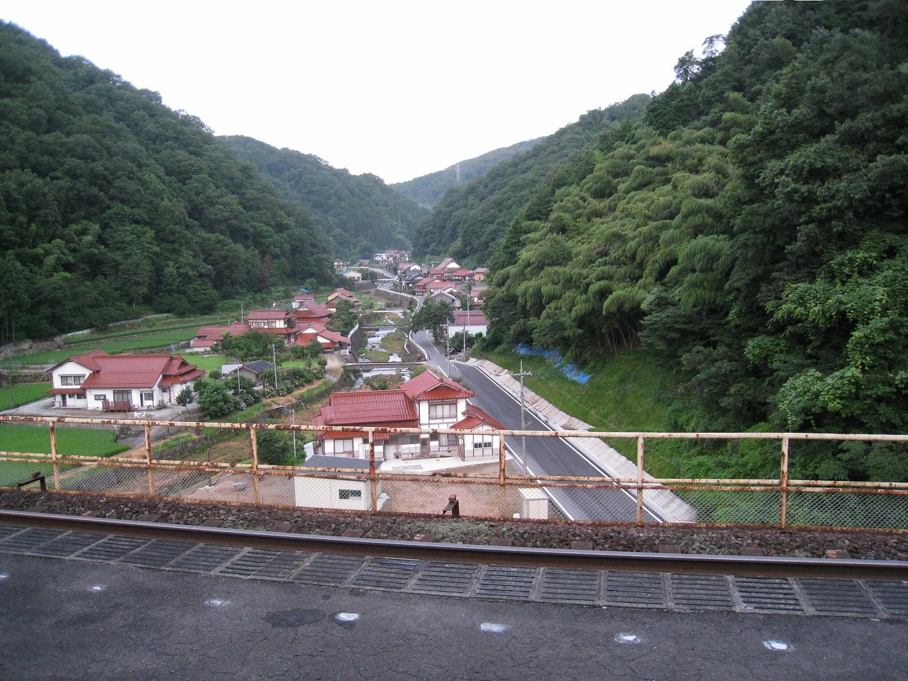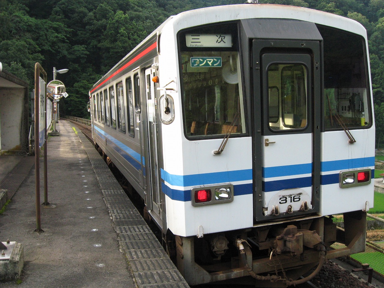 階段を登り切ってホームに戻ると、意外とゆっくり見て歩いたのか、列車の時刻までそんなになかった。もう夏の朝七時だというのに、日が差すということがない。それほどに谷であり、中国山地のまっただ中なのだ。