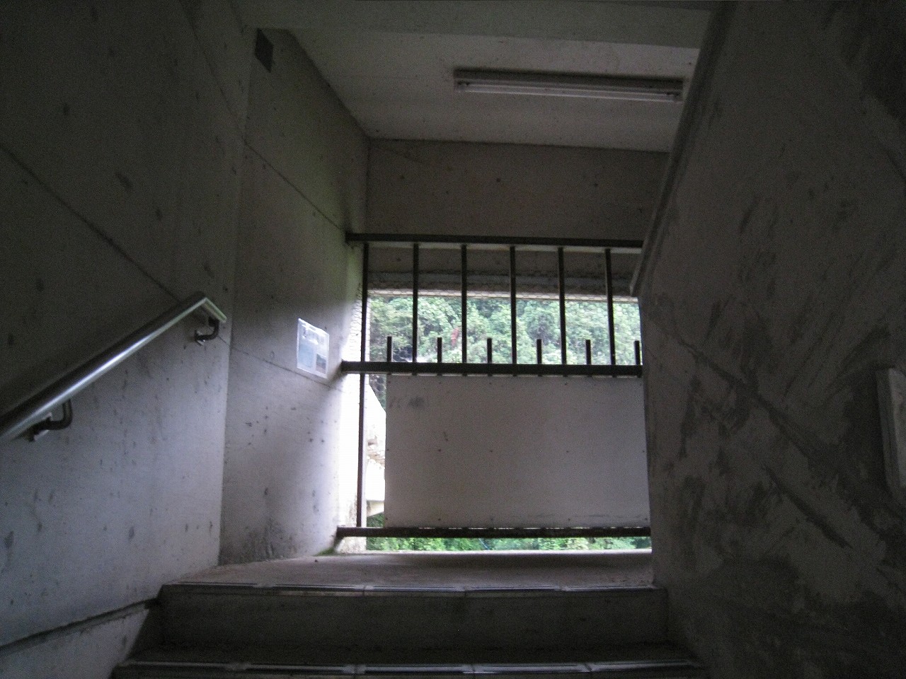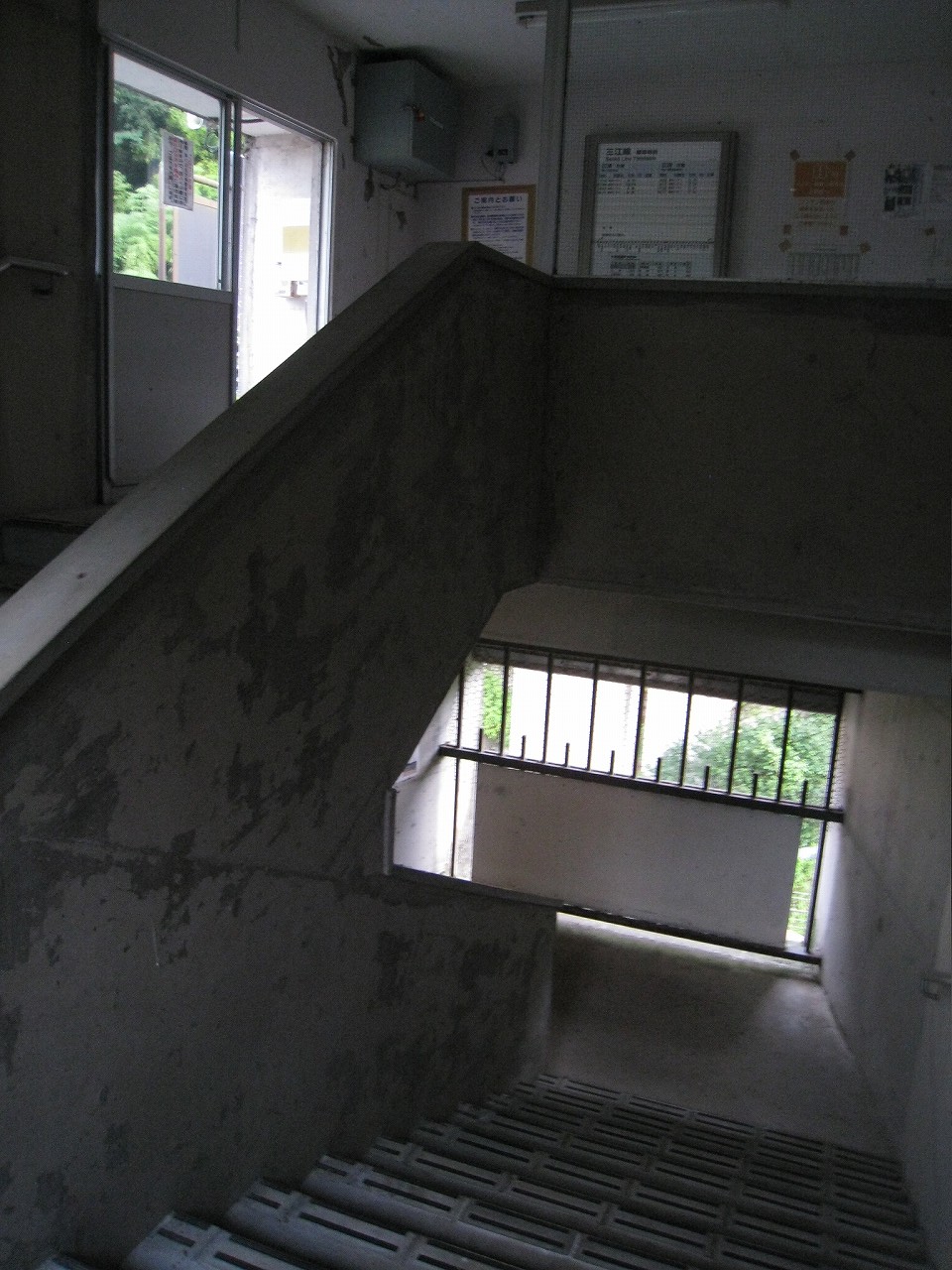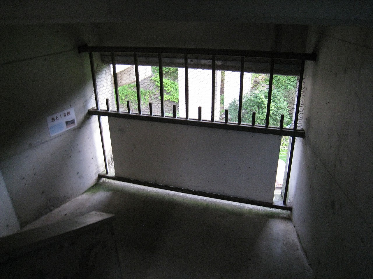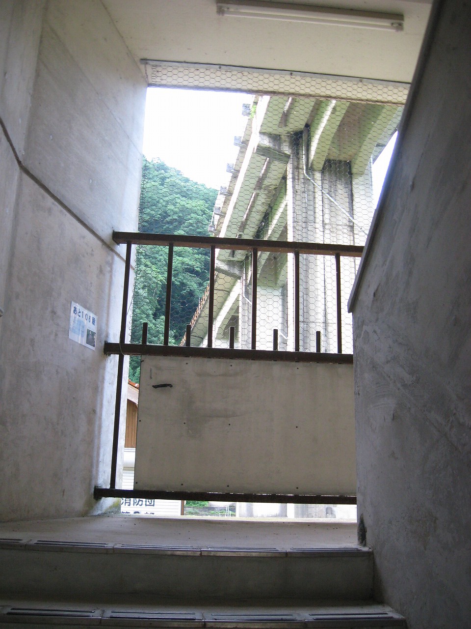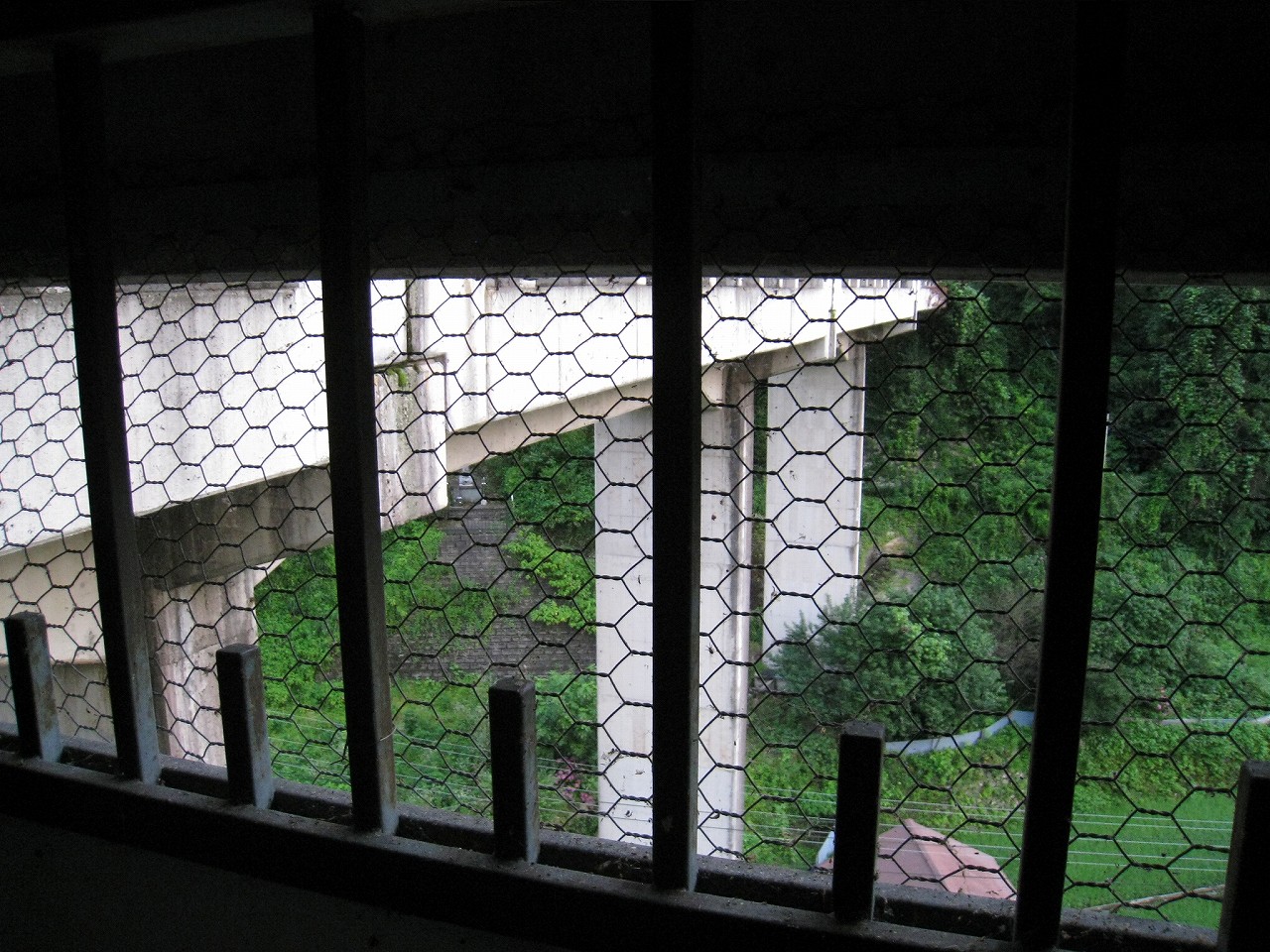 踊り場に来るたびに景色が見えるが、通例下半分はコンクリの壁を造成するのに、そこが完全になくて、柵だけになっていた。柵を設置してからコンクリを造成したことになるが、このやり方だと柵の交換が難しくなるので、通常はしなさそうだ。しかし、コンクリートの使用量は抑えられる。あとは全面にハニカムな金網が適当に貼られていて、またそれが全体を時代がかったものに見せていた。