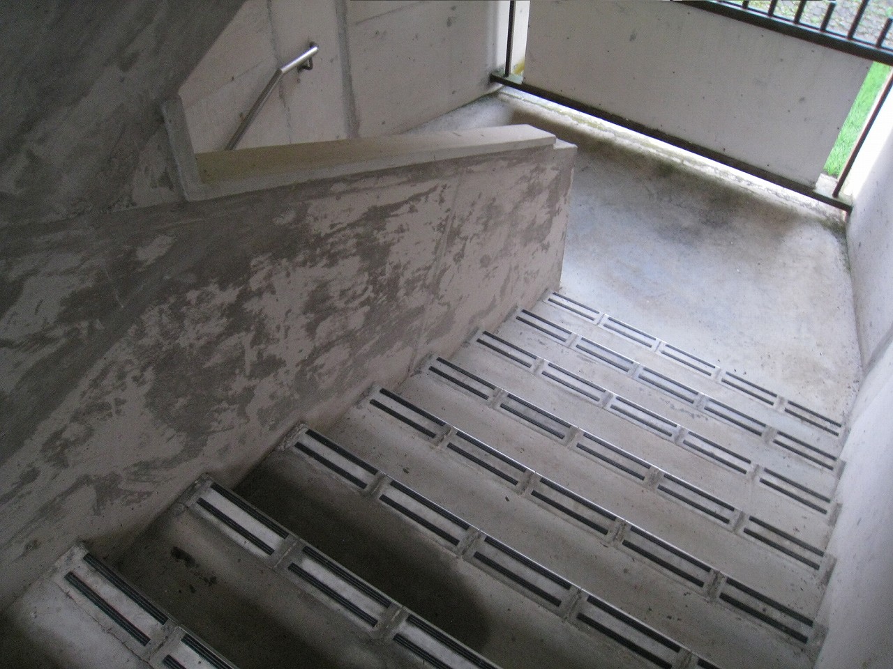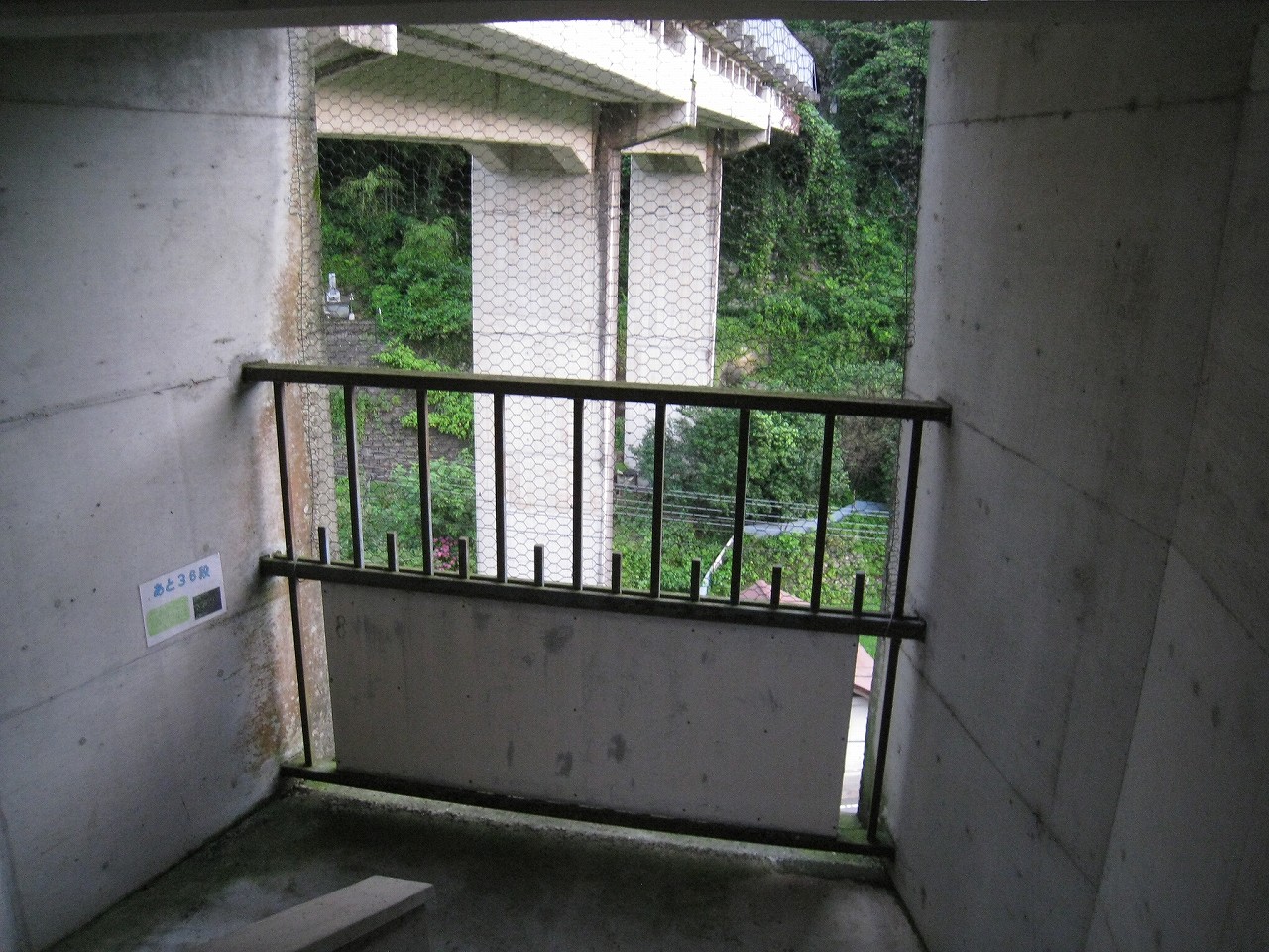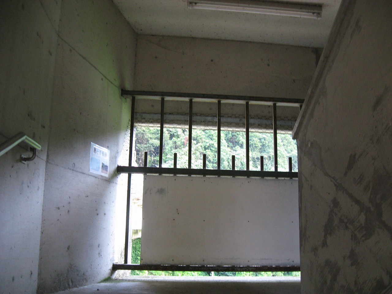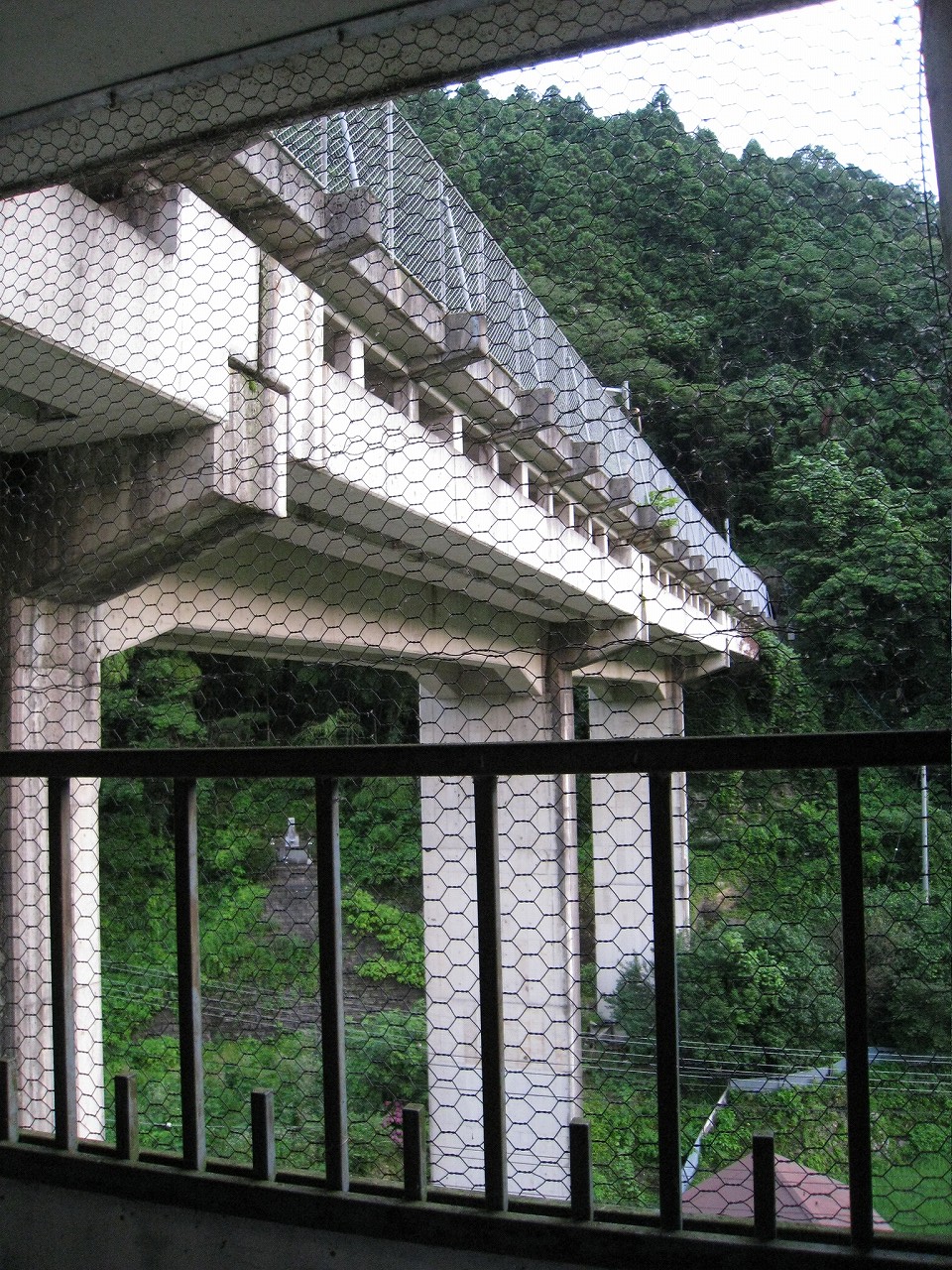 踊り場に来るたびに景色が見えるが、通例下半分はコンクリの壁を造成するのに、そこが完全になくて、柵だけになっていた。柵を設置してからコンクリを造成したことになるが、このやり方だと柵の交換が難しくなるので、通常はしなさそうだ。しかし、コンクリートの使用量は抑えられる。あとは全面にハニカムな金網が適当に貼られていて、またそれが全体を時代がかったものに見せていた。