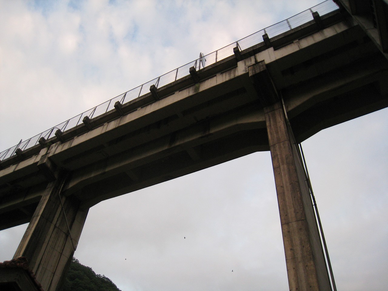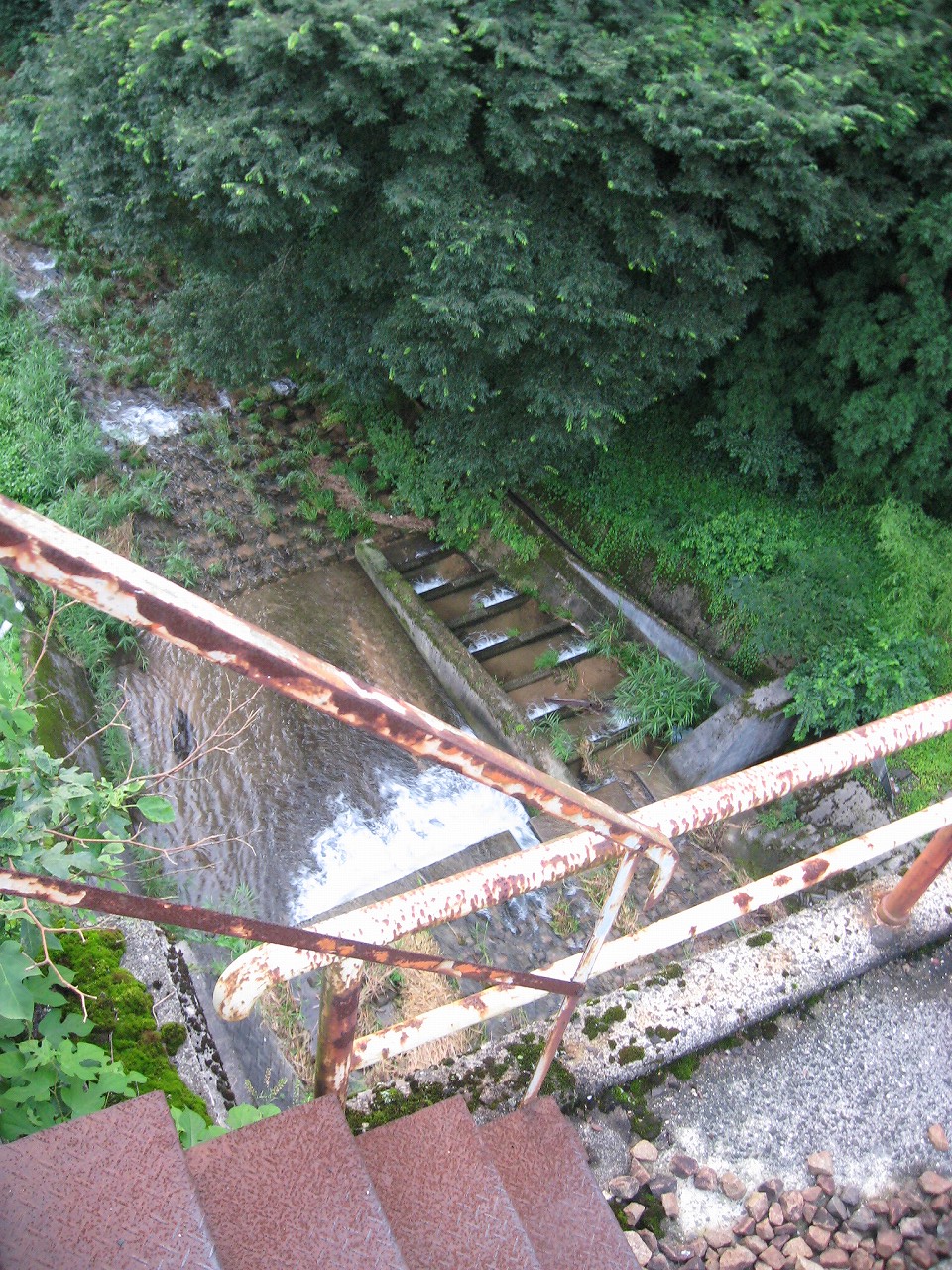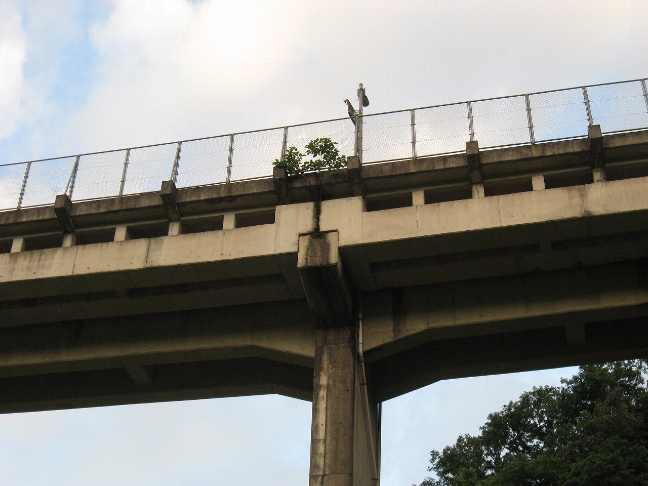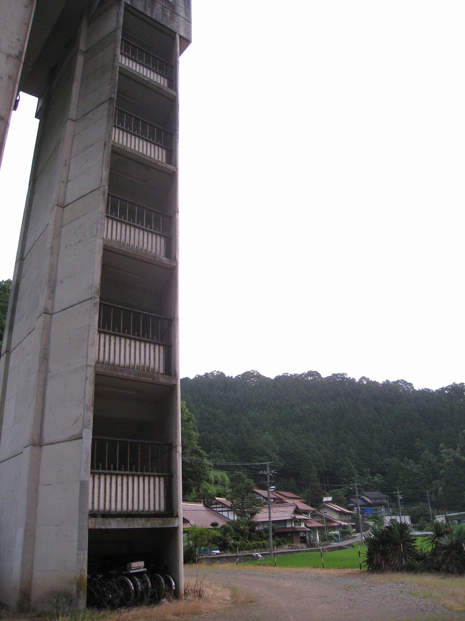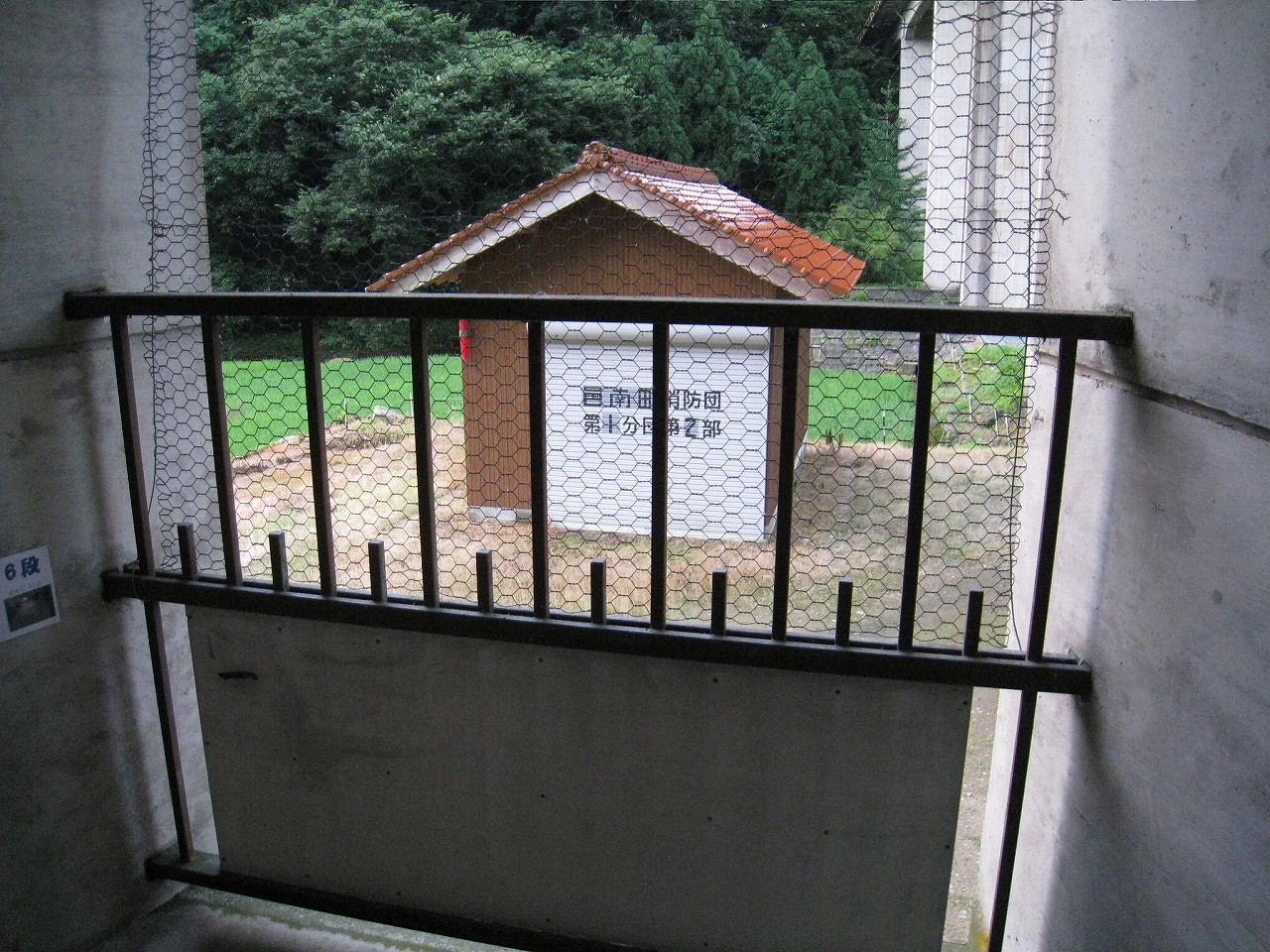 踊り場に来るたびに景色が見えるが、通例下半分はコンクリの壁を造成するのに、そこが完全になくて、柵だけになっていた。柵を設置してからコンクリを造成したことになるが、このやり方だと柵の交換が難しくなるので、通常はしなさそうだ。しかし、コンクリートの使用量は抑えられる。あとは全面にハニカムな金網が適当に貼られていて、またそれが全体を時代がかったものに見せていた。