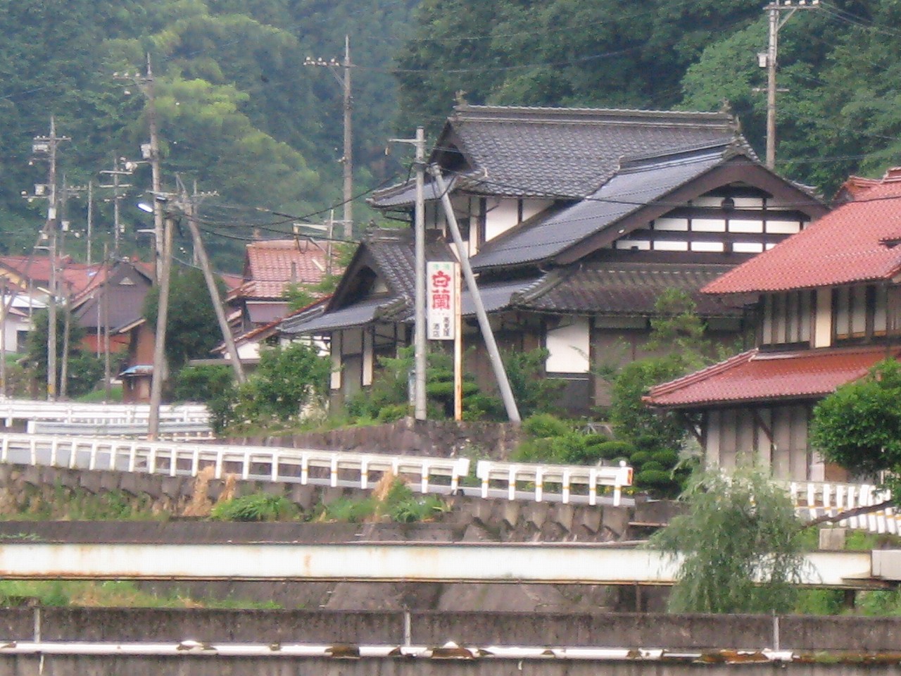 谷の奥の方に向かって歩いてみた。宇都井川沿いに石州瓦の奥ゆかしげな人家はつづき、ただ早朝の川のせせらぎだけが聞こえてきていた。ここは下郷といい、遡るに従って、中郷、上郷と集落があるという。遠くに清酒の行灯看板を発見! お店なのかなぁと思う。