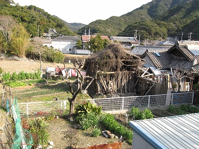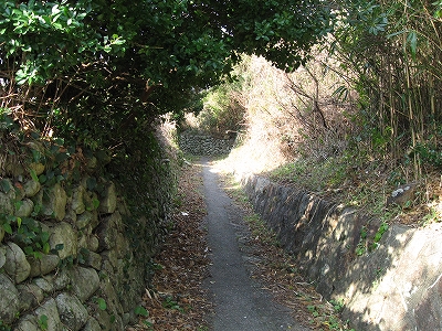 出口に差し掛かると、眩しい陽だまり、朽ち果て、錆びた蔦に絡められた木造を見ると、とある初夏を思い出した。実際、暑くなってきていた。三井連絡船? そんな昔の鉄板がポールから提げられ、「連絡船があるのか? この小さな隠れた浜からか? どこへいくんだろ。」と思う。不思議な低い石積みの隠し道もあり、岩代の葦に隠された秘密の通路を思い出して、