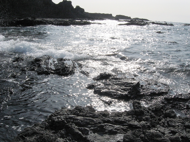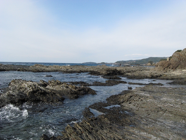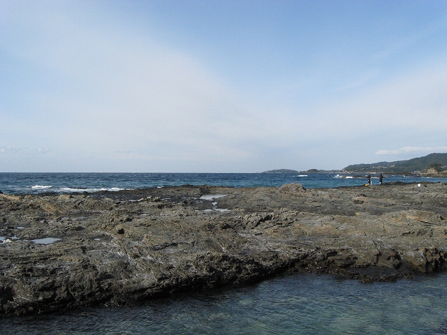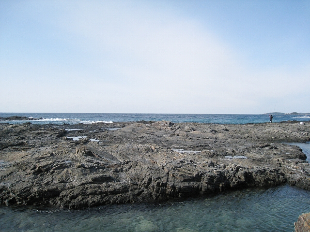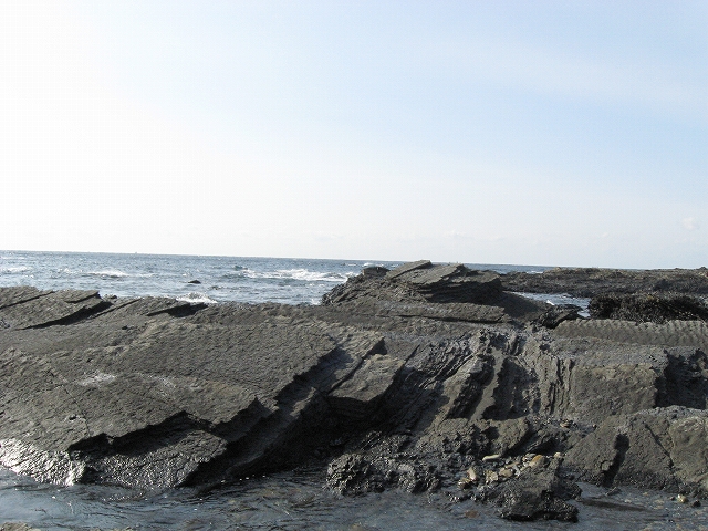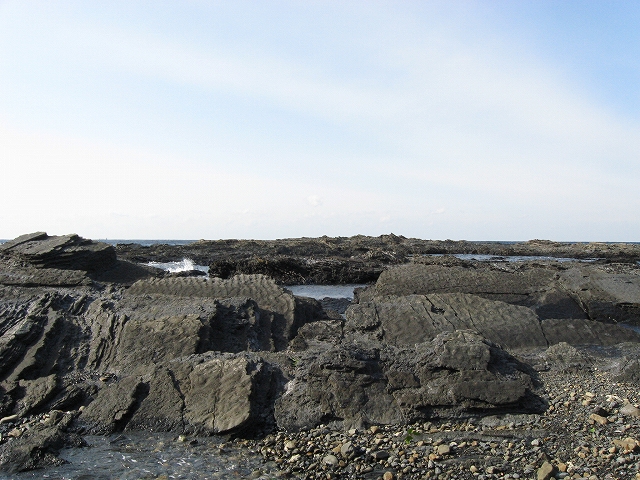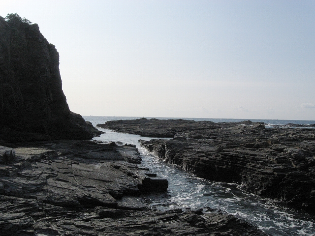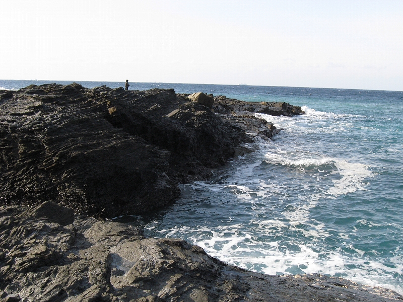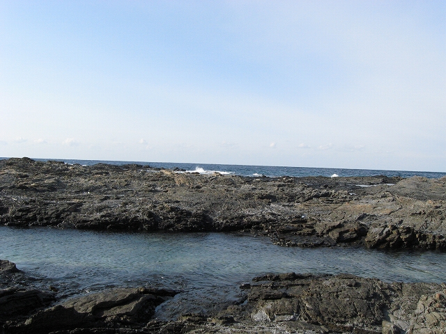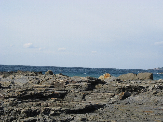 やがて現役の海食崖が現れ、見事な地層を見せているな、と思ったら、もう磯に足はとりついていた。真っ黒なでっかい岩盤のようで、刃をミルフィーユのように十重二十重に薄く重ねていて、繊細に等高線を築いている。人間がこんな彫刻をしたらさぞかし立派で、賞賛されるだろうなあ、そういうものが、ずっとずっと向うまで広がっていた、決して一様でない。よく考えついたなと思うほどだ。しかもそれにとどまらず微妙な潮溜り、厳しいクレバスの淵を備え、それは見渡すと、見事な造形芸術の、岩礁地帯なのだった。遠くには太陽が海を果てなくきらめかせている。これが太平洋、黒潮かと思った瞬間だ。「ほんとにあったんだな。冬の黒潮は夏じゃないか。ここは常夏なんじゃないか? 冬がいやなら、ここに来ればいい! 決まりきった称揚と評判があるだけでなく、本当にあったのだ!」