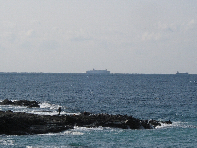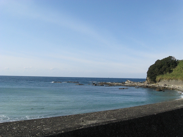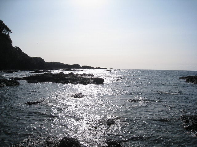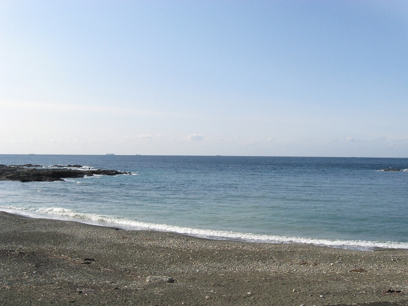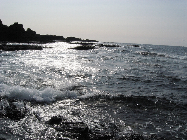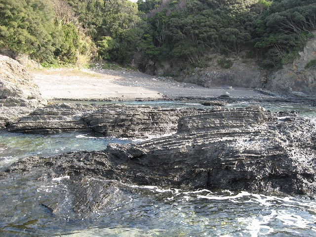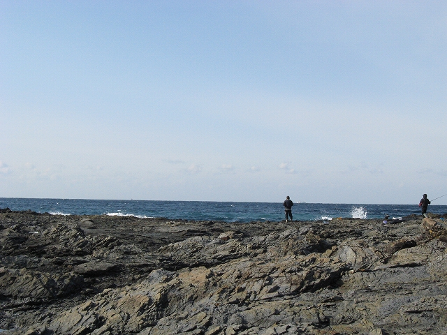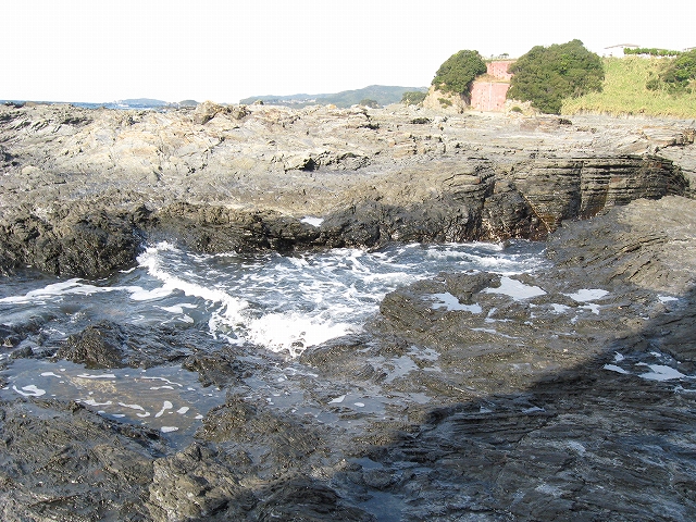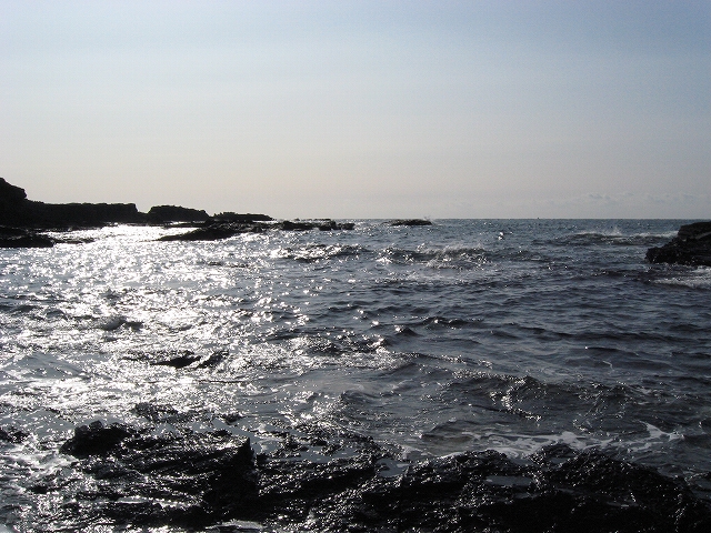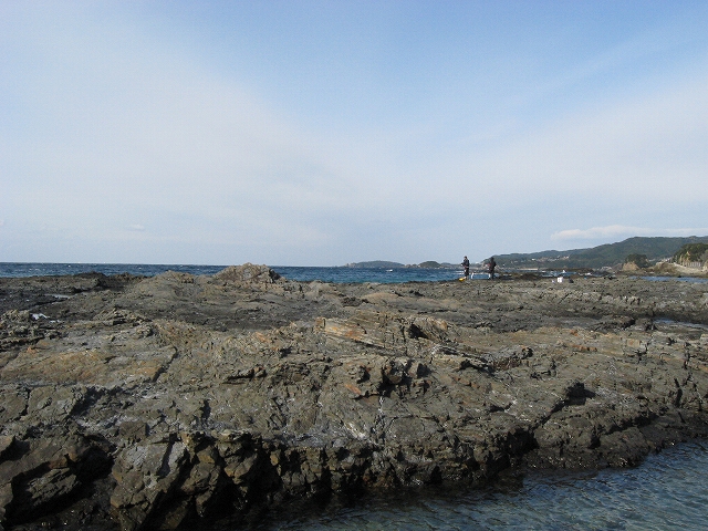 やがて現役の海食崖が現れ、見事な地層を見せているな、と思ったら、もう磯に足はとりついていた。真っ黒なでっかい岩盤のようで、刃をミルフィーユのように十重二十重に薄く重ねていて、繊細に等高線を築いている。人間がこんな彫刻をしたらさぞかし立派で、賞賛されるだろうなあ、そういうものが、ずっとずっと向うまで広がっていた、決して一様でない。よく考えついたなと思うほどだ。しかもそれにとどまらず微妙な潮溜り、厳しいクレバスの淵を備え、それは見渡すと、見事な造形芸術の、岩礁地帯なのだった。遠くには太陽が海を果てなくきらめかせている。これが太平洋、黒潮かと思った瞬間だ。「ほんとにあったんだな。冬の黒潮は夏じゃないか。ここは常夏なんじゃないか? 冬がいやなら、ここに来ればいい! 決まりきった称揚と評判があるだけでなく、本当にあったのだ!」