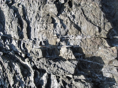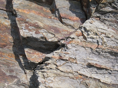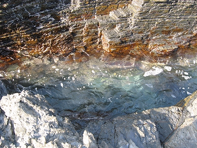 私はそれを眺め下ろしながら先端まで歩くが、こうも刃が幾層にも重なっていると、磯の上で滑って転ぶだけでも体中傷まるけになりそうだった。波浪にこんなものへ叩きつけられたらと思うともはや諦めしか感じない。 何度か尖った小峰に危うげに立ち、地層のミルフィーユを観察しながら、行きつける限界に達した。もう先は隠顕岩で、波に見え隠れするばかりだ。私はそこで叫んだ。