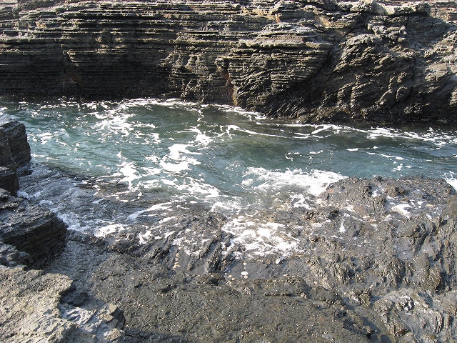 液体のトパーズに乳化剤を暴力的に混ぜられた色あいの中、泡沫が突き上げられ、裂壁の海溝の中で暴れている。そこを渡れば本土と切り離された岩礁だ。私は渡ろうと思った。しかし狭いところでも一間分と少しあった。荷物を置き、呼吸を整える。幅跳びをしようと、するのだが、どうしても身がすくんだ。落ちたらただでは済まないというより、体は水力でバラバラになること請け合いだった。気づく人もいなかろう。もっといいくびれがあるかもしれないが、いまは太公望をうらやみつつ、私はその海峡を和深海峡と名付けた。和深海峡は深く、真黒な巌と寝覚めの海色で美しい海峡だ。