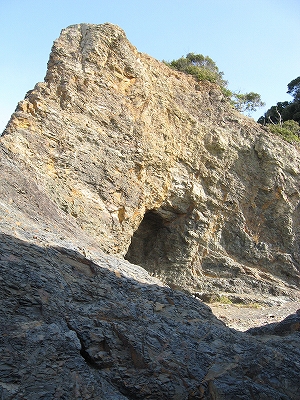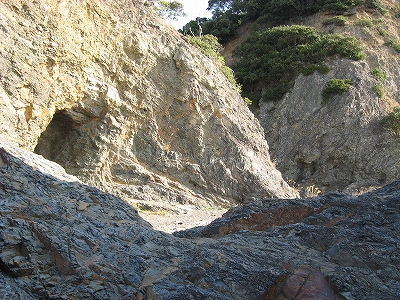 砂崖に洞穴の成り損ねがあり、キャンプした痕が遠巻きに見える。日陰で植生も回復しつつあり、かなり不気味なところだったので、こんなところまで人が来てんだなと思った。花火や菓子の残骸あるも、健康な若人にとっては、こんな陰湿の城も格好の遊び場となるようなのは頼もしく、その残骸を私はいちいち仔細ありげに眺めた。賞味期限がだいぶ前のだと、少し安心する。日当たりに出ると黄土色の岩に海蝕洞がいくつか口を開けて、それはもう冒険へのいざないだった。