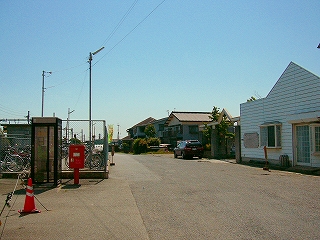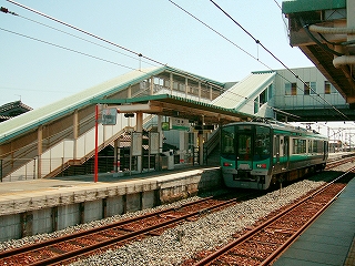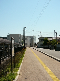 奇怪の暗さと音の世界から出て、ようやくホームで味わった初夏の居心地よい空気に出会う。あのコンコースは、風通しがあまりない。厳然たる慎ましやかさで、懐かしげの集落の中で、一本道が伸びている。その道幅を遥かに超える新築駅舎が、こうして道奥に聳立し、集落にねじ込まれ異様だ。それとも将来はこの駅舎の幅に合わせて道を広げるのかと思ったが、道はすぐT字に当たり、やはり周りは交通量とは無縁ののどかのところなので、なさそうな感じだった。
