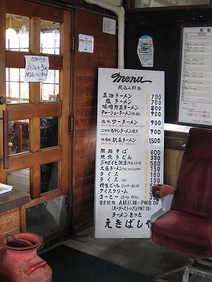 私もっぱら待ち合いで過ごさざるを得ない。古いカンテラなどの駅務室の道具が極端に日光で脱色した数々の写真とともに飾られている。はじめは無人駅の居抜きのラーメン屋というのがポイントだったのだろうけど、たぶんうまいせいで、駅のことは忘れられてただラーメン屋として機能するようになっているのかもしれない。こんなとこきこそ入ればよいが、この辺の駅はあらかたこんなふうに商いをしてるいるので、降りるたんびに食べるわけにもいかず、メニューばかり見ていた。ラーメンとしては順当な価格ではないだろうか。