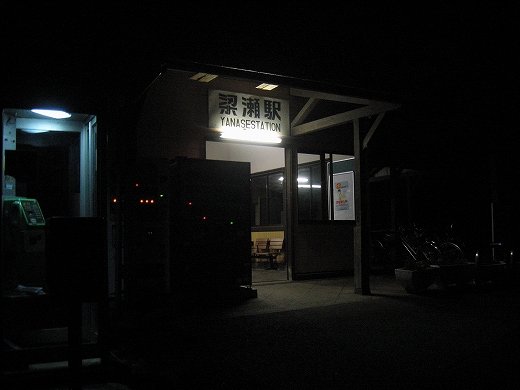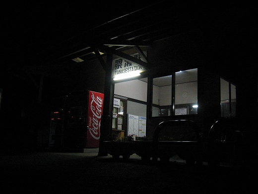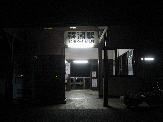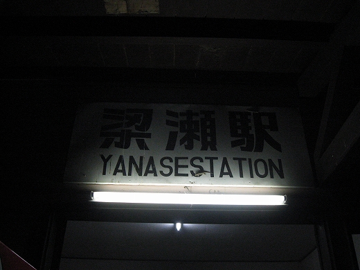 駅舎はやはり開業時、戦前のもので古い木造がいっぱいの魂をふくんで悄然と立哨している。蛍光管のまわりには小さな虫が飛び交い、梁瀬駅との表示を照らし出していた。しかしそれを見るものはいるだろうか? 夜に屋に背駅と堪忍してここに来る人が! 下にはYANASESTATIONともあった。大正ロマンだろうか。