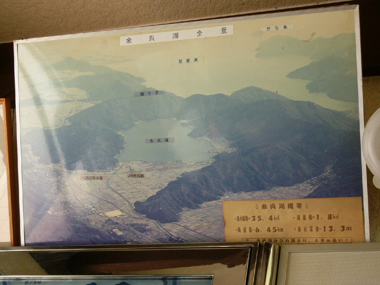 神秘の湖と呼ばれる余呉湖。平均標高は132m。 深い緑の山々に囲まれて、静かに水をたたえていた。 太陽が雲に隠されているだけましだったが、 じっとりと蒸し暑いため、水の生臭さが漂っていた。 これは、夏ならどの湖にも漂っているにおいだ。 余呉に投宿し、気持ちの良い早朝に余呉湖の外周をサイクリング。 そんなプランも考えられた。 実はここに来る前は、距離が約5kmなのを知った上で、 徒歩で余呉湖を周ろうかと思っていたのだが、 思いのほかスケールが大きく、見るや否やその計画を放棄。 なるほどそれでレンタサイクリングに力を入れているわけだ。 しかし、こうして余呉湖を眺めていると、冬はさぞかし引き締まって美しいのだろうなと思った。 美しいというか、どか雪でそれどころではない可能性もあるけれども。