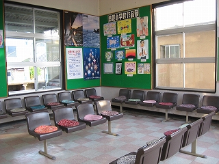 待合室。七尾線の駅は、改札前の段差と、待合室の床に市松模様のあるのが何よりも特色。