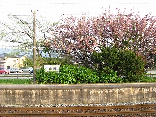 八重桜。駅名標が埋もれている。