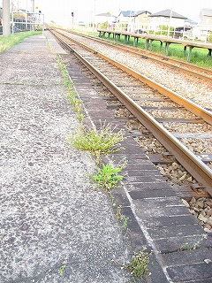 能登部よりもホームの植え込みが濃く、その上に夕日で燃える鬼火が浮かび、その陰が暗緑色になっていた。駅には誰もいない。みんなどこにいるのだろう。