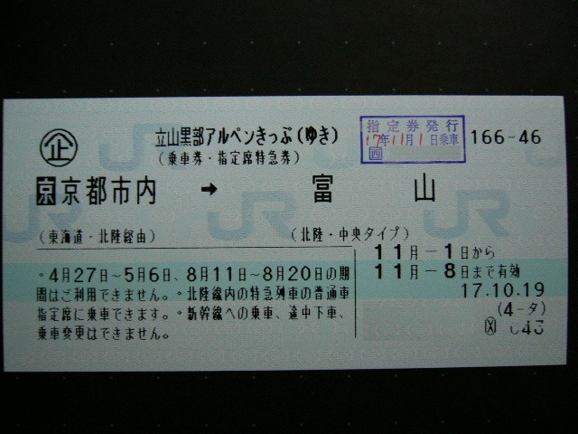 1日目に富山へ向かうため、大阪発富山行きのサンダーバード1号の指定券を取った。 約2週間前だったが簡単に取れてよかった。