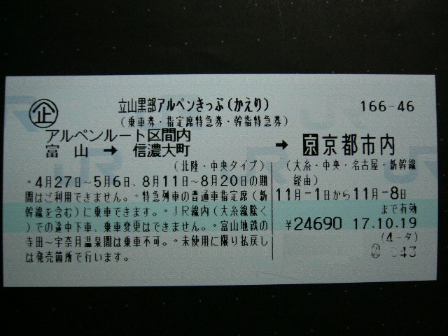 今回の旅行は鉄道の旅と立山の自然を再び味わうことにあり、 11月1日から2泊3日で2人で行った。 私も今回はほとんど運良く機会を捉えた感じで、 この2人で行くことが決まったのは1か月ちょっと前だった。 そのときから少しずつ準備をしはじめて、 出発日が近づくにつれて計画の綿密さや準備の忙しさが増していったという感じだった。 立山行きが決まったと同時に「立山黒部アルペンきっぷ」を用いることに決まった。 このきっぷを用いると、鉄道の旅と立山を楽めるように計画を立てることができる。 きっぷの詳細はだいたい上で述べたとおりで、8日間有効だから、 幕営をする本格的な登山者にとっても便利なきっぷかもしれない。