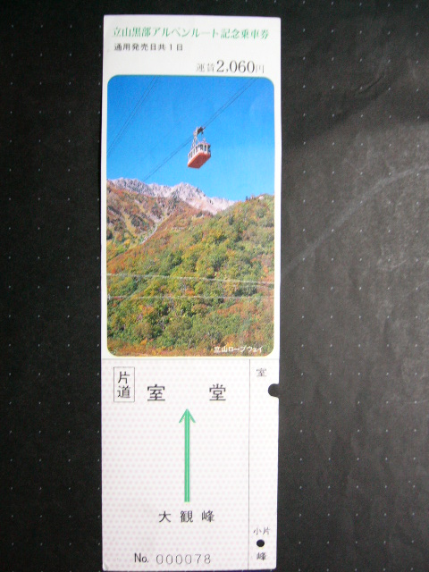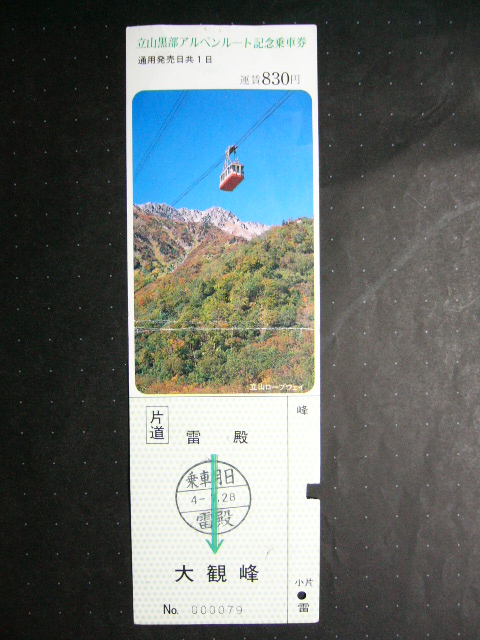 だった。この雷殿歩道は現在落石により道がつぶれ、通行不可能であり、立山トロリーバス も全便雷殿駅を通過することになっている。実は私たちが12年前に雷殿歩道を通ったときも、ちょうどタンボ平へ下る道が分岐している手前を歩いていたとき、その十数メートル先で巨石の落石があった。そのときは、その驚異的な力に驚かされたが、その後、落石が起こりそうになかったことから、右手が険しい断崖になっている道を慎重に進み、雪渓を越えてさらに進んだ。途中メンバーの一人が断崖を滑落しかけて道にしがみついたり、左横の高い崖の低い位置から、つけもの石程度の石が落ちてきたりでたいへん印象的だった。途中右手遥か下方には黒部湖が感じ取れた。やがて不気味で古いコンクリートの巨大なトンネルの入口が立ち現れた。はじめこれは関係なく巻くのかと思ったが、ほかに道がない。覗いてみると中は真夏の昼でも涼しくて暗くて、こんなところを進むのかと恐れたが、ここしか道がないので、暗闇の中へと入っていった。途中こうもりにびっくりさせられた。こわごわ進み続けると、駅務室らしい小さな小屋の明かりが見えた。そこではなんとストーブが焚かれていた。そこで立山トロリーバスのきっぷを買い、大観峰駅へ向かったのだ。この駅には駅名標などはなかったように思う。ところて、そのとき買ったきっぷが残っていた。 以上が雷殿駅、雷殿歩道の思い出だ。この道のおかげで気軽に少し本格的な散策を 楽しめただけに、現在の通行不能は残念でならない。かといって、室堂から東一ノ越、 タンボ平を下って黒部平へ行くには約4時間20分もかかるというし、ためらってしまう。 しかし一度はタンボ平を歩いてみたいと思っている。室堂駅、みくりが池、地獄谷展望台、雷鳥平、の順に進み、 一ノ越への道中、室堂山荘を見下ろしたところで、来た道をそのまま引き返し、 室堂駅へ戻る