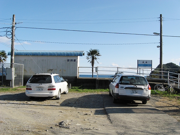 ところで、さっきから土の敷地の奥のほうに妙なマイクロバスがとまっていて、少し気味が悪かった。はじめ廃車かと思っていたが、そうではなく、どうも運転手が乗っていて何かを待っているようだった。しかしあんな目立たないところで待つものは何もなさそうだ。あまり近寄らないようにした。ホームの出口あたりにも駐車があり、たぶん列車を使っている人のものだろうと思っていると、2台とも運転席に人が乗っているのだった。そう…3台とも、時間つぶし…。そこからでは海は見えないから、ただ休みたいだけなのだとよくわかった。