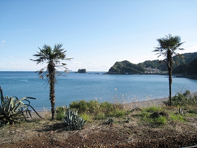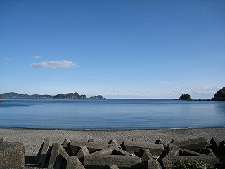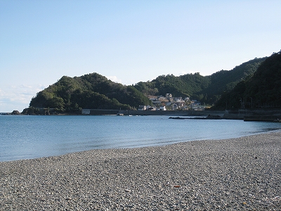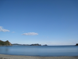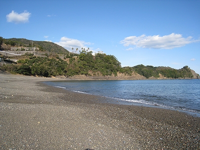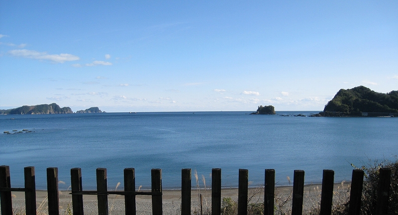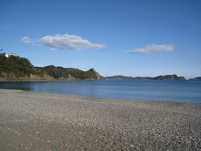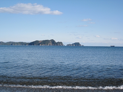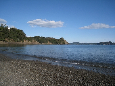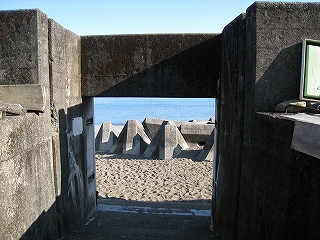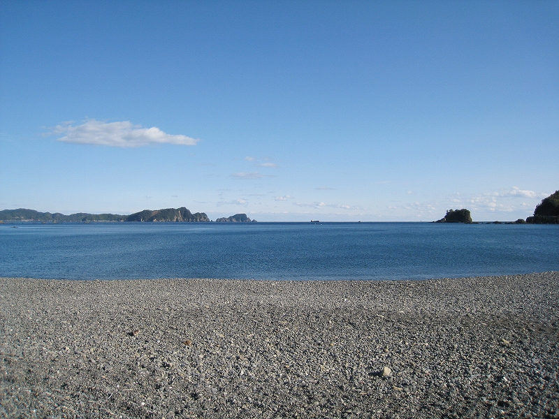 とにかくそのあたりから適当に海に出られそうな道を探した。ありそうでなかったらいやだなと思いながら探すと、それらしいのが1つ見つかって、どうなんだろうと前だけを見るような感じでかなり早歩きに進むと、やはり堤防前に来た。まるでトーチカのような入口がある。何かのときには鉄板の扉を閉め切るのだろう。そこをくぐると、砂浜が広がっていた。駅から見下ろした砂浜だった。砂は深く、すぐ靴に荒い砂が入りそうになった。青く棚引く汀はまだ向こう。でも、もう海はすっかり自分の手中に納まっていた。それなのにまだどこか足が早い。ざくざくざくざく。ところが不思議なことに、汀の少し前から石ころに変わり、少し歩きにくくなった。がら、がらがら…。だがもう足元の前には薄く広がる海の水があった。ずっと向こうは、ただ茫洋たる海だった。空は優しい水色、そこにわずかに灰色の雲のかけらが浮いていて、確かに冬だった。遠くでは深々とした群青色を湛える海は、こっちでは透徹する水を裾のように静かにしまったり広げたりしている。とにかく波が穏やか。でもけっして池のようではなく、静かに静かに太平洋は波を打ち寄せていた。左遠くの海岸はへつり歩けそうな岩場になっていて、そんな感じの岩場をまとった島や陸地が遠くに少し見えた。海岸の美しいところだった。