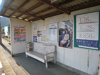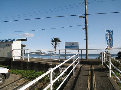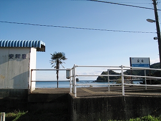 割とぎりぎりまでいたため、あまり国道沿いを見たりもせず、やや急ぎ足で駅へと向かった。一台分ぐらいの幅員の坂道をつめる。つめ終わると、土ばかりの更地。ホーム待合所の壁に貼られた安和駅との文字ばかりが、駅らしさを醸していた。昔はその更地に木造駅舎があったのだった。のりばへのスロープを上り、静かにホームへと入る。さっきまで自分がいたはずの海岸がすっかり見渡せた。もうここを去るんだな…。いつまで見ていても不思議なぐらい飽きない、安和海岸。眼球が青色になっているのではないかと思われた。