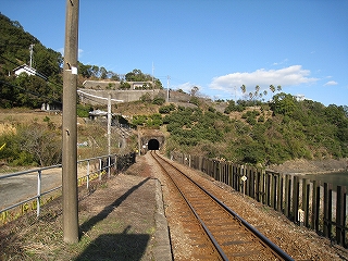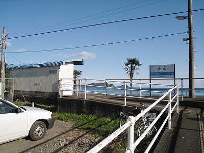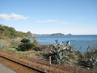 着いてから少し時間が経つとホームの周りや駅構内を見られるようになった。しかしやはり海に気持ちがとられたままで、なかなか落ち着かない。ホームはいわずもがな1つだけ。レールが海に面しているのだが、レールの向こうは風変わりな植物が並んで、その先が斜面になっているのだった。そのため海浜から10mぐらい高く、とてもいいぐあいに見下ろせるようになっている。海風をめいいっぱい受ける待合所の壁の前には古びた長椅子が1つ、灰皿が1つ。設備や規模はほんのそれきりだが、来た方向を見ると、昔は間違いなく転轍機があったようだ。その向こうはトンネルになっていて、鉄路は岬をくぐって来ていた。その岬の上にはガラス張りの小さな良さそうな建物がある。なんだろう。