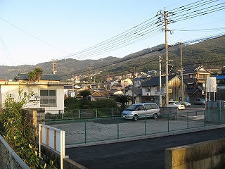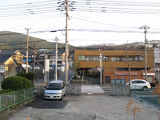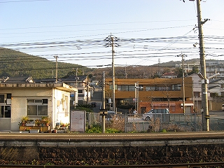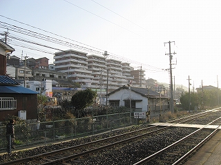 山裾にも住宅地が広がっていた。左手の建物の側面が駅舎。