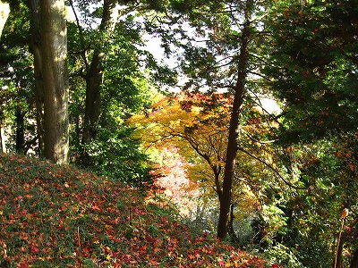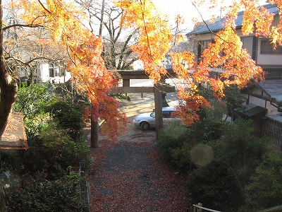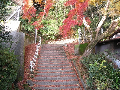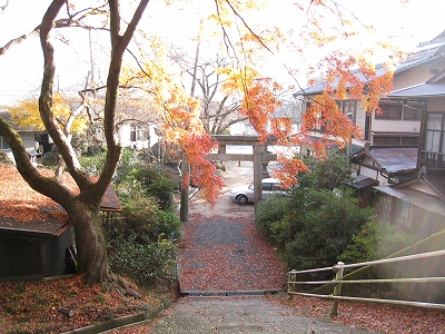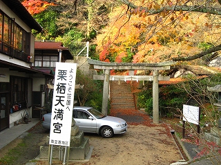 かたはらにもみぢふ山に石の階(はし)あるを見て、まうづべしとぞ思ひぬ。栗栖天満宮なるなり。菅原道真公をぞたてまつりたまへり。転ばむとす険しき いしばしをのぼりあへ、散りしかれぬるいろいろのもみぢ踏みしだきてゆくに、あしたの霧ならんや、いくらかたえてひちて透きたるものありけり。ほつえにさがりたるひとひらのもみぢは露そひて、いとど匂ひにけり。頂きにつきてせばき参道を歩かば、倉など佇みたりてしめやかなるなり。ふと向かひのつらの本殿のまへにて、奉りて棲まへる人ならむや、三十ばかりの女、あをまもりてあからさまに優におもてうちかたぶけたらむけはひすずろに覚へるに、いとおどろかれぬる心地こそしぬれ。さにあらむも、あなや、とくここをかるべし、あやしまれてむ、とて、せはしくいしばし下りたりき。しかれども当世の人のこれを読みしかばいかでことわらむや。