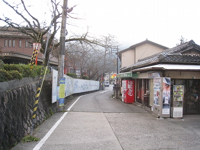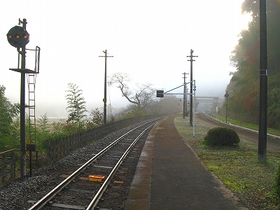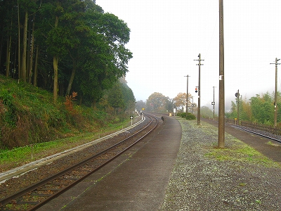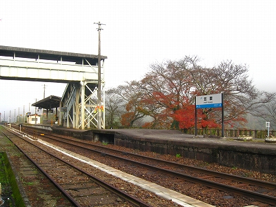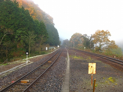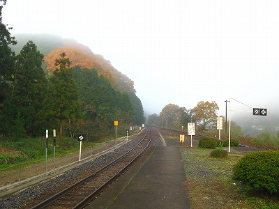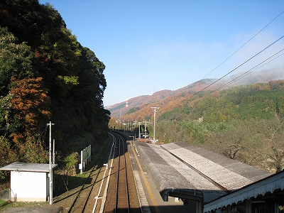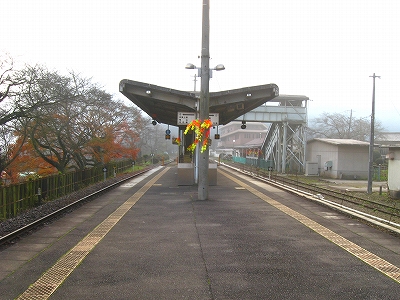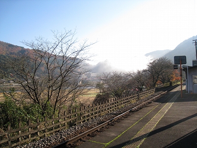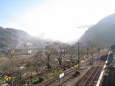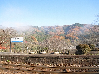 笠置なる駅につきぬ。古の旅人もや休みけむ、さらばあも休まほしう思ひておとなひつるが、いと冷たく指ぞ裂くるごとくなりし。こほりにぞふれるたらむや。川面よりいみじう霧わたりて、さらに消ゆけしきなく、げにいぶせきこと言わむかたなし。かたはらの常盤木の山裾に、もみぢふ木の一本のみけやけかるを、いとをかしう思ひき。あはれ、寒かりしも、竜田姫はおとなふらむを。