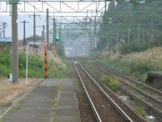 無人駅。でも決まりきった2面3線なものの乗り場の規模や構内は本格的なもので、旅人に緊張さえ誘い、これも新潟らしかった。ホームを歩いていると、どこからともなく人や東の駅員が出てきそうな気がするのだ。辺りは農地だっていうのに。