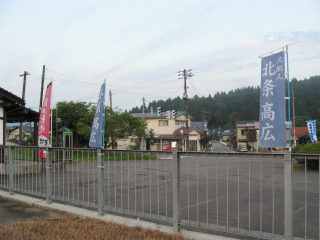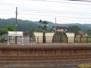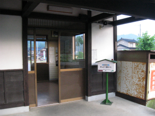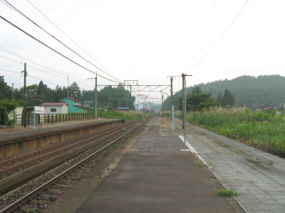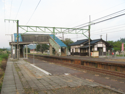 椅子も改められ、ホームの待合所は取り壊されているが、中越地震がらみもあるのかなどと思う。それなら仕方ないけど。駅舎は小ぶりな擬古様式で白壁に木柱が目立ってる。庭としてか、転回部としてか、広い池がしつらえられてたが、水は抜かれて久しそうだった。駅前わりと広く、意外に堅実な感じだ。でも昔は利用が多かったという遺構や感触はない。