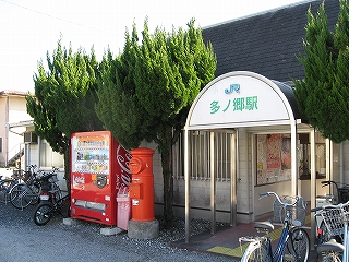 駅の建物は小さいが、ポーチの上の駅名入りアーチ屋根が、多ノ郷駅という駅の印象を、ここに来た人たちに確かのものとしていた。両脇の緑に燃えるカイヅカイブキとともに。朱色の丸いポストがあった。その横の販売機の赤が、調和して引き立ち、美しかった。駅前の広場も狭く、整備前というたたずまいでタイヤ柵で駐輪スペースが区切られていたりした。タイヤで馬跳びを思い起こす。ぜんたいとしてどこともなくあたたかな駅前だった。