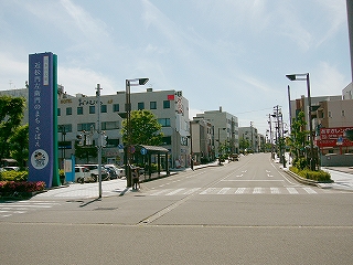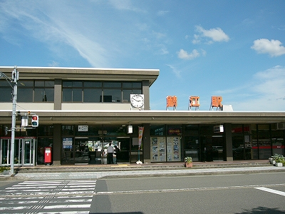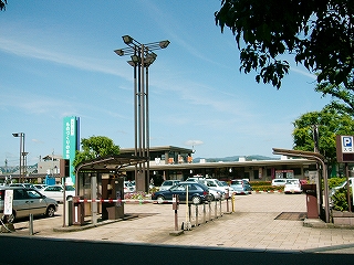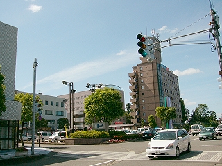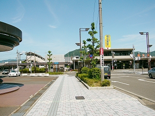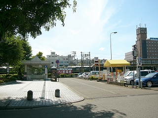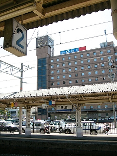 外へ出た。まぶしい。けれども暑くなく、いいときに来たんだなと思う。けれども秋のようではなく、艶かしさと、どこか胸騒ぎを覚える陽気。あそこのつつじも、ここのつつじも花をつけている。駅舎を出たら軒下の回廊ではあるが、そのすぐ前に道路が走っている。初めは何にも考えず道路を渡ったのだけど、よく考え直すと、主要駅の真ん前が主要道というのはほとんど見かけない。ふつう転回場があって、それから道路になる…。そういうわけでタクシー乗り場は別のところ、ロータリーはこの道路を挟んで向こうにあった。しかし駅を出て駅前風景がすぐ広がるというのはなかなかよかった。ロータリーにはL字のビルが、どんと建っていて、これがほかならぬ駅前の代表風景となっていた。4階建てで、4階部分はホテルだという。