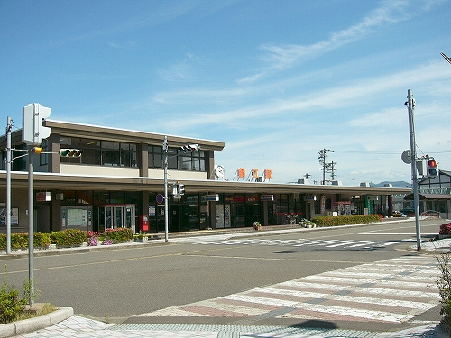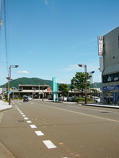 少し離れて見ると、奥の橋立山と駅舎が一緒に見えた。駅にまっすぐやってくるこの道をいつも走っている人は、この山のことを忘れないだろう。その風景は少し今庄が迫ってきているように思わせた。