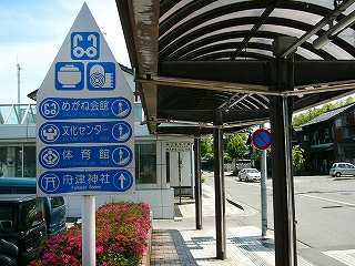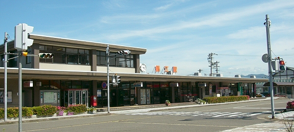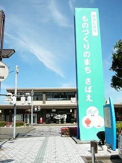 「世界に誇る、ものづくりのまち、さばえ」と駅舎。