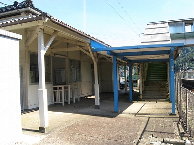 気密な交番の、冷房の効いてそうな中でちらつく人影に、不自由さと緊迫がちらつく。そのほかは、民宿を交えた みな同じ高さの甍の群れのただ中だった。駅はそれらと融け合い、瓦屋根に板壁の町並みから、同じ材質を用いつつも、民家とは違う形態で 駅舎というものが生まれてきた謎の解き明かしがここにありそうであった。